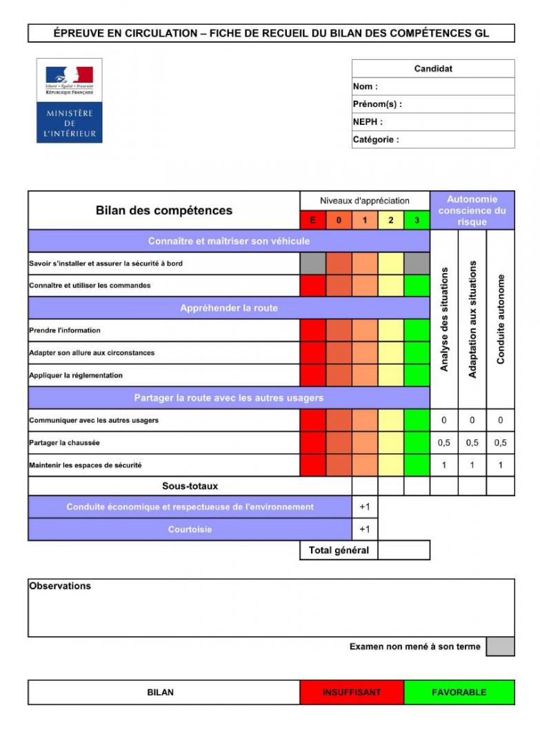 - réalisation d'une épreuve de maniabilité (marche arrière évaluée seulement)
